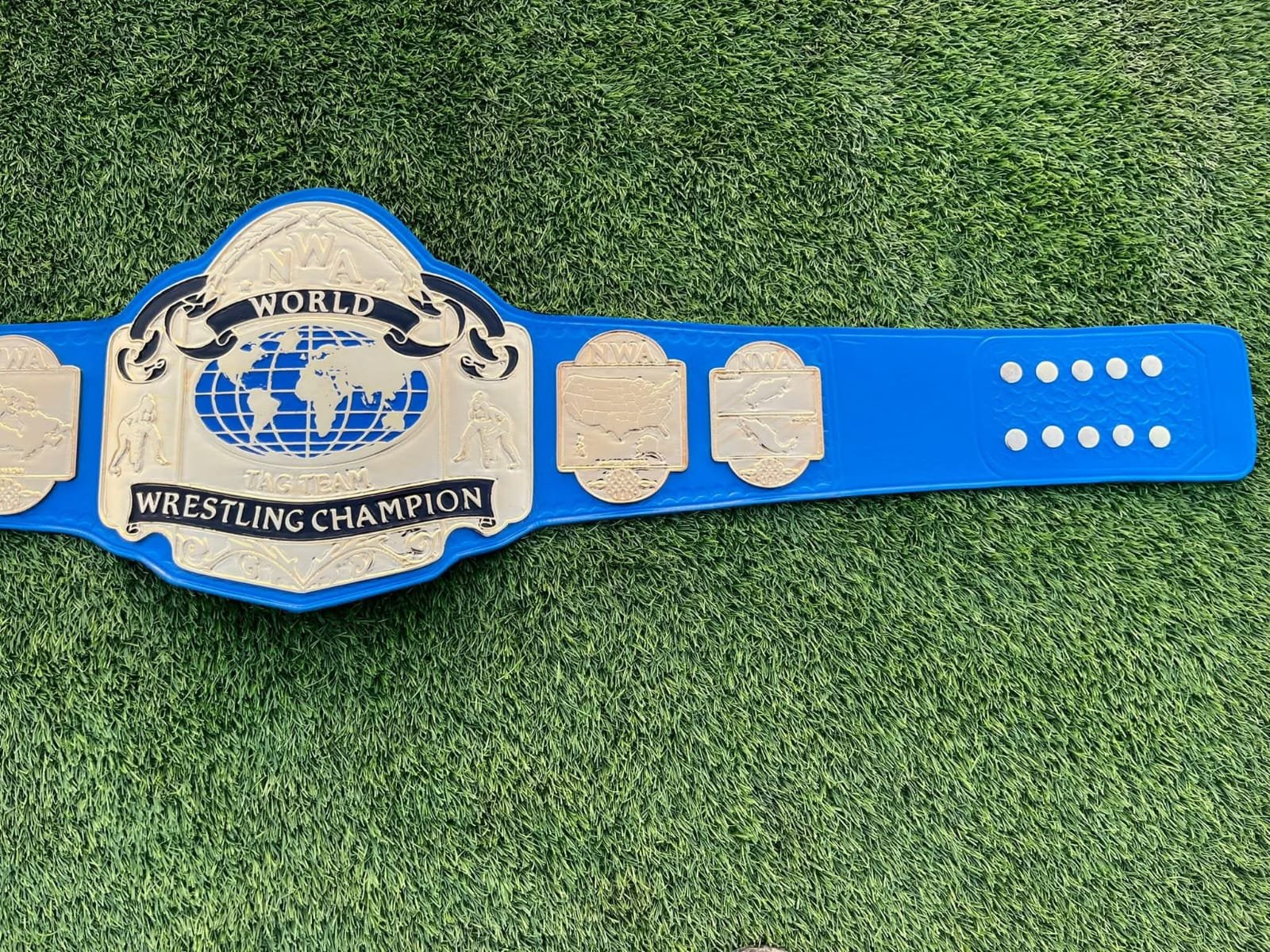 Celebrate the legacy of classic professional wrestling with this beautifully crafted NWA World Tag Team Championship Replica Belt. This championship title captures the rich history and prestige of the National Wrestling Alliance, featuring a stunning blue strap and detailed gold plating that represents champions from around the globe. Perfect for collectors, fans, and wrestling enthusiasts.