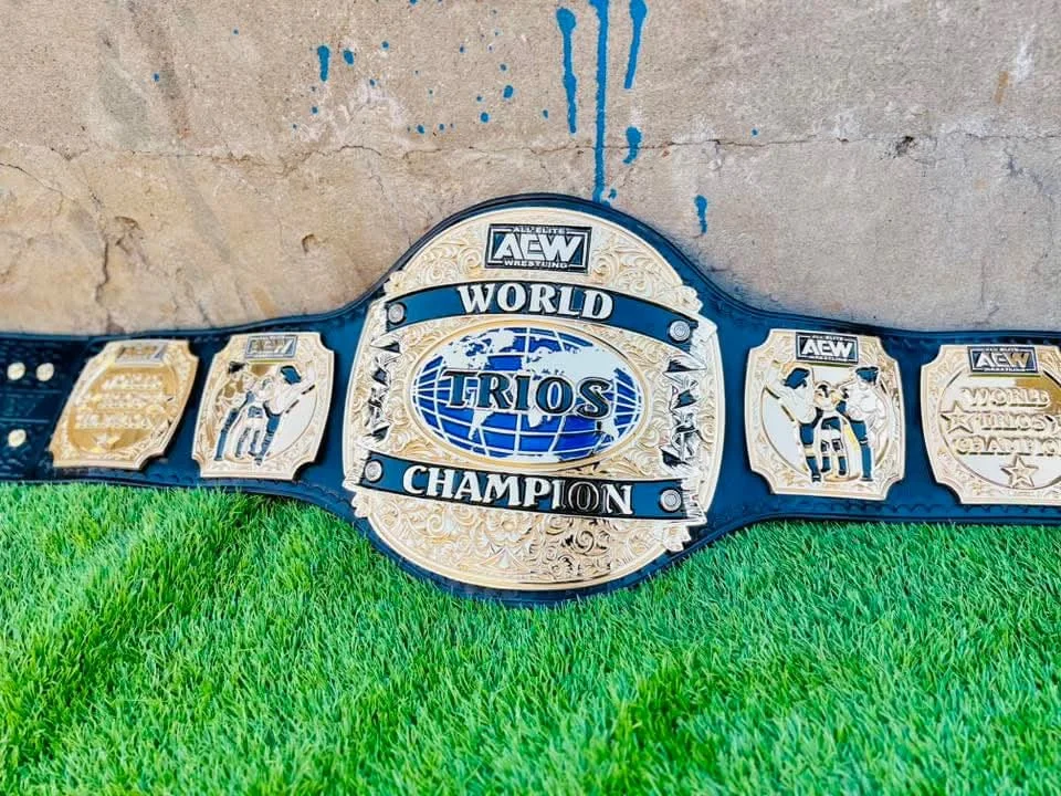 This AEW world trios championship replica belt runs on 4mm thick zinc alloy plates with a 24K gold finish across every surface. The center plate stretches approximately 11 x 8.5 inches large, bold, and loaded with detail. A blue globe background fills the center, giving it that world prestige feel straight out of AEW programming. The AEW logo sits engraved prominently on both the top and side plates. Bold lettering across the center reads “WORLD TRIOS CHAMPION” with no ambiguity, no compromise. Side plates carry detailed wrestler artwork that ties the whole teamwork theme together. The genuine black leather strap runs 52 inches total, fits up to a 46-inch waist, and features hand-stitched detailing throughout. The snap closure system locks clean and holds firm.