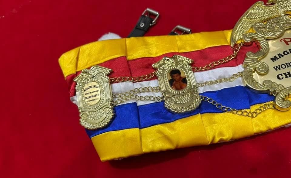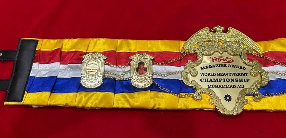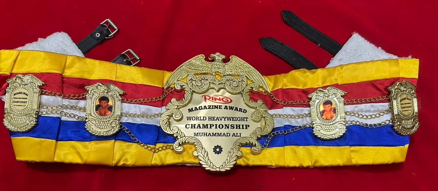 he RING MAGAZINE MUHAMMAD ALI BOXING CHAMPIONSHIP BELT is a prestigious item for any boxing fan, featuring the iconic name of boxing legend Muhammad Ali (Cassius Clay). Made by Champion, the belt is designed for adults and showcases a gold color with a capacity of more than 50 oz. This championship belt is a unique collectible item suitable for both male and female fans of boxing, showcasing a piece of sports history from the world of professional boxing.