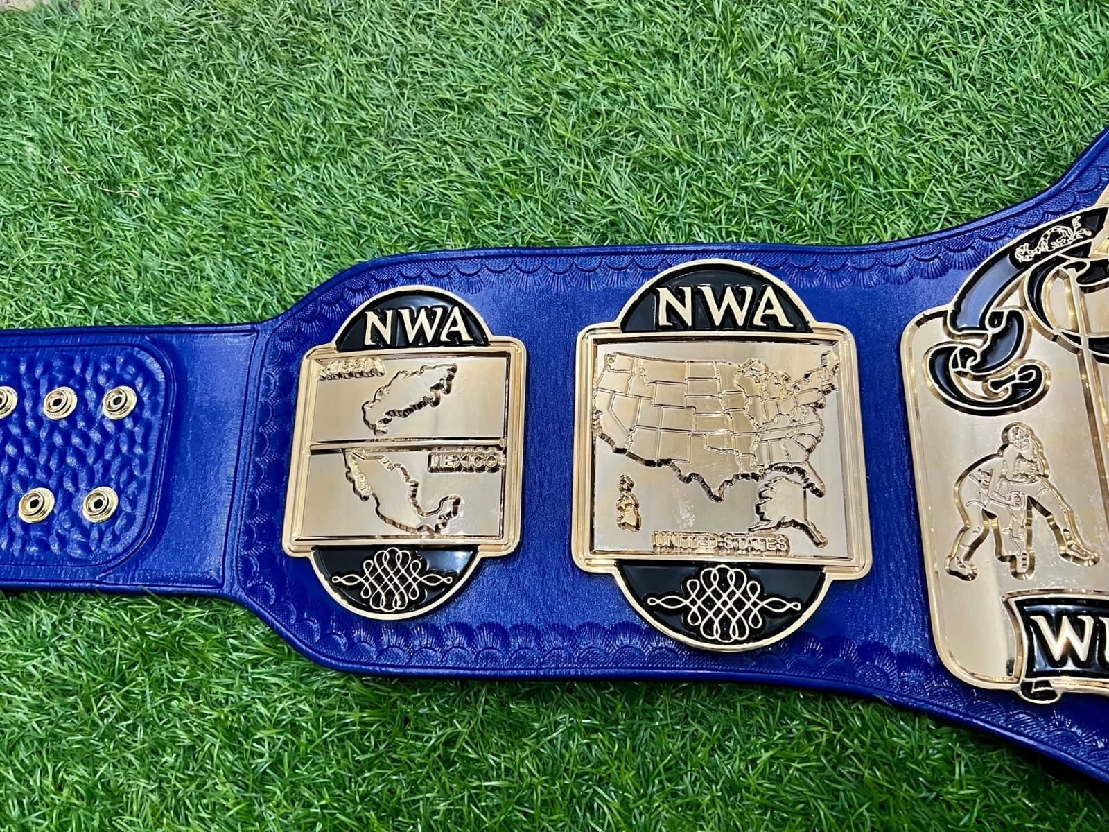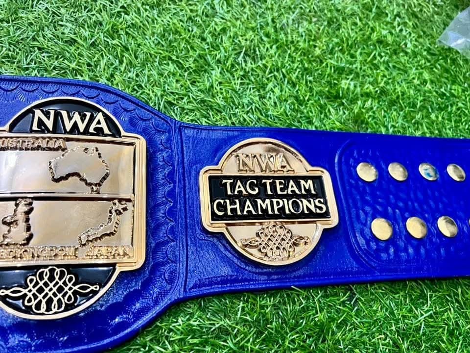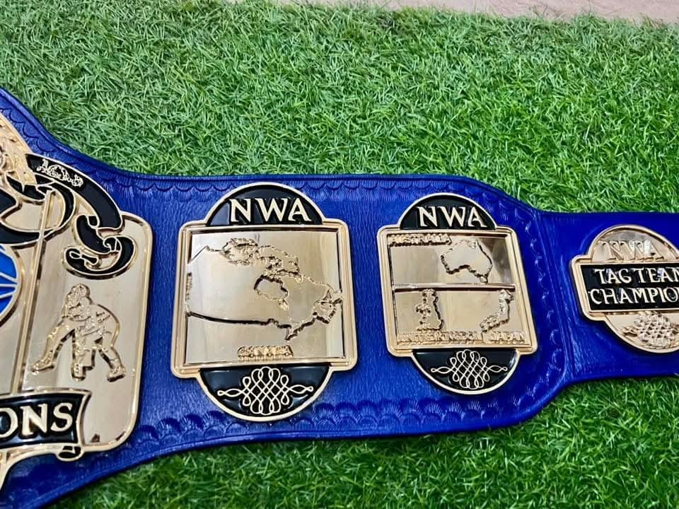Premium quality NWA World Tag Team Wrestling Championship Belt crafted with durable 4MM CNC thick zinc alloy 24K GOLD plates and finished in high-polish gold plating. This belt features a stunning blue globe center design with detailed side plates and a deep blue leather strap, making it perfect for collectors, wrestling fans, display, or promotion use.