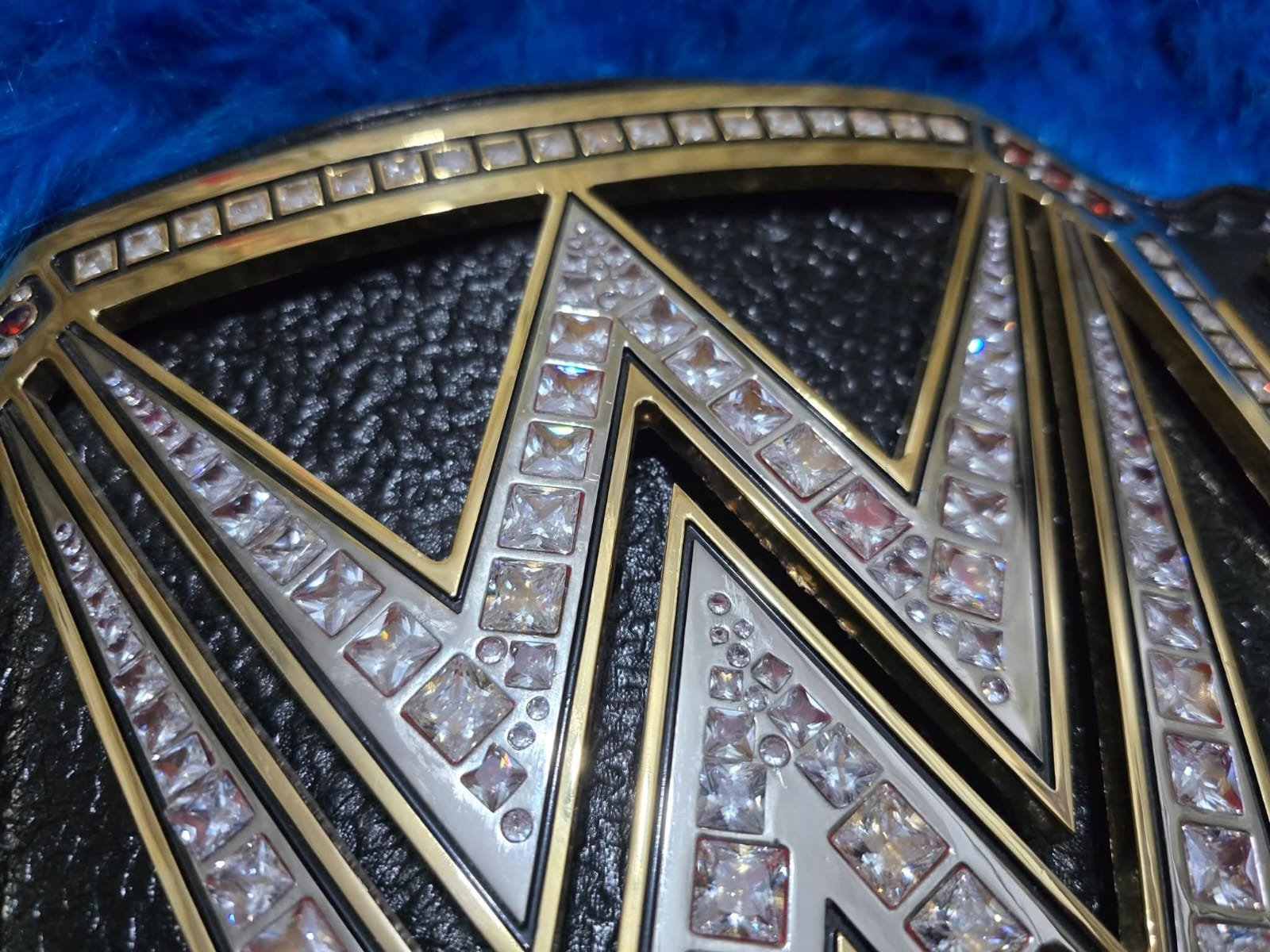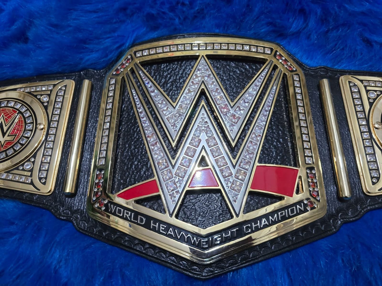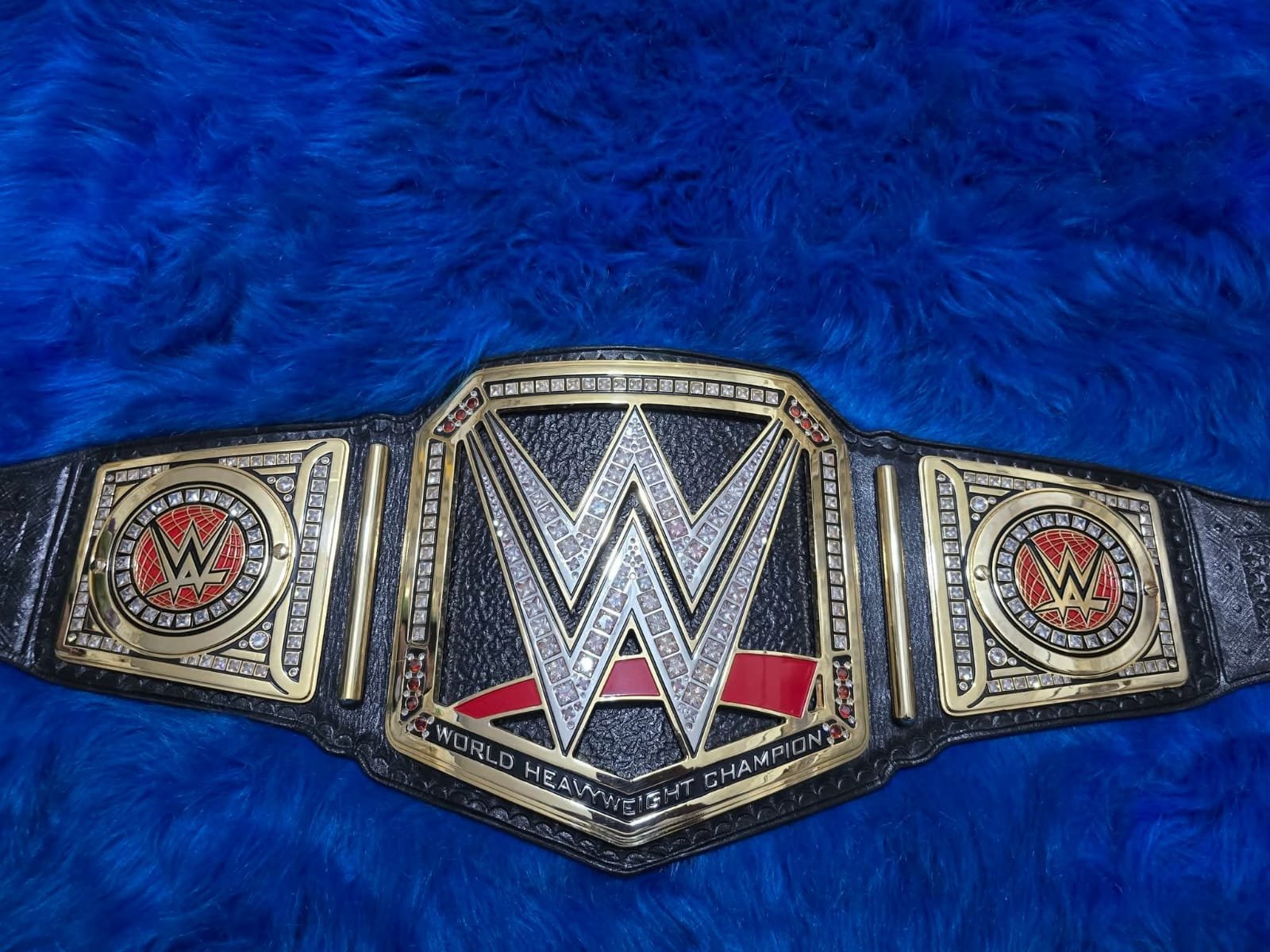 The large center plate showcases the iconic WWE logo covered with clear stones and red accents, giving it a bold and championship look. The side plates feature matching WWE logos with detailed stone work for a luxury finish.